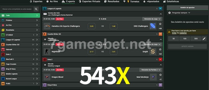 O 543X oferece uma grande seleção de opções de apostas em e-sports com probabilidades competitivas